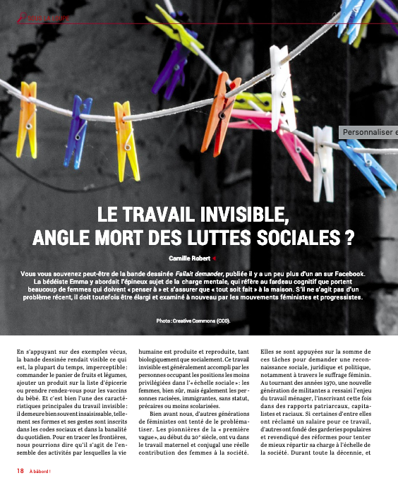 ROBERT, Camille. « Le travail invisible, angle mort des luttes sociales? », À Bâbord, no. 78, février-mars 2019, p. 18-23.